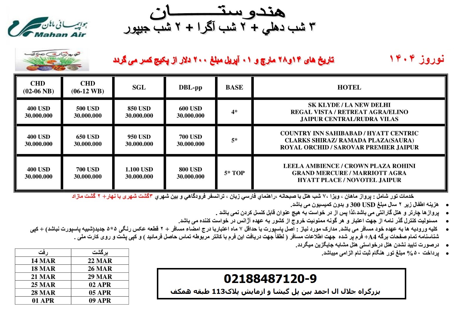 بلیط رفت و برگشت پرواز ماهان، 3 شب اقامت در دهلی، 2 شب اقامت در آگرا و 2 شب اقامت در جیپور، صبحانه، ترانسفر رفت و برگشت فرودگاهی، یک گشت شهری در هر شهر همراه با نهار (در مجموع 3 گشت نیمروزی)، راهنمای فارسی زبان و ویزا.